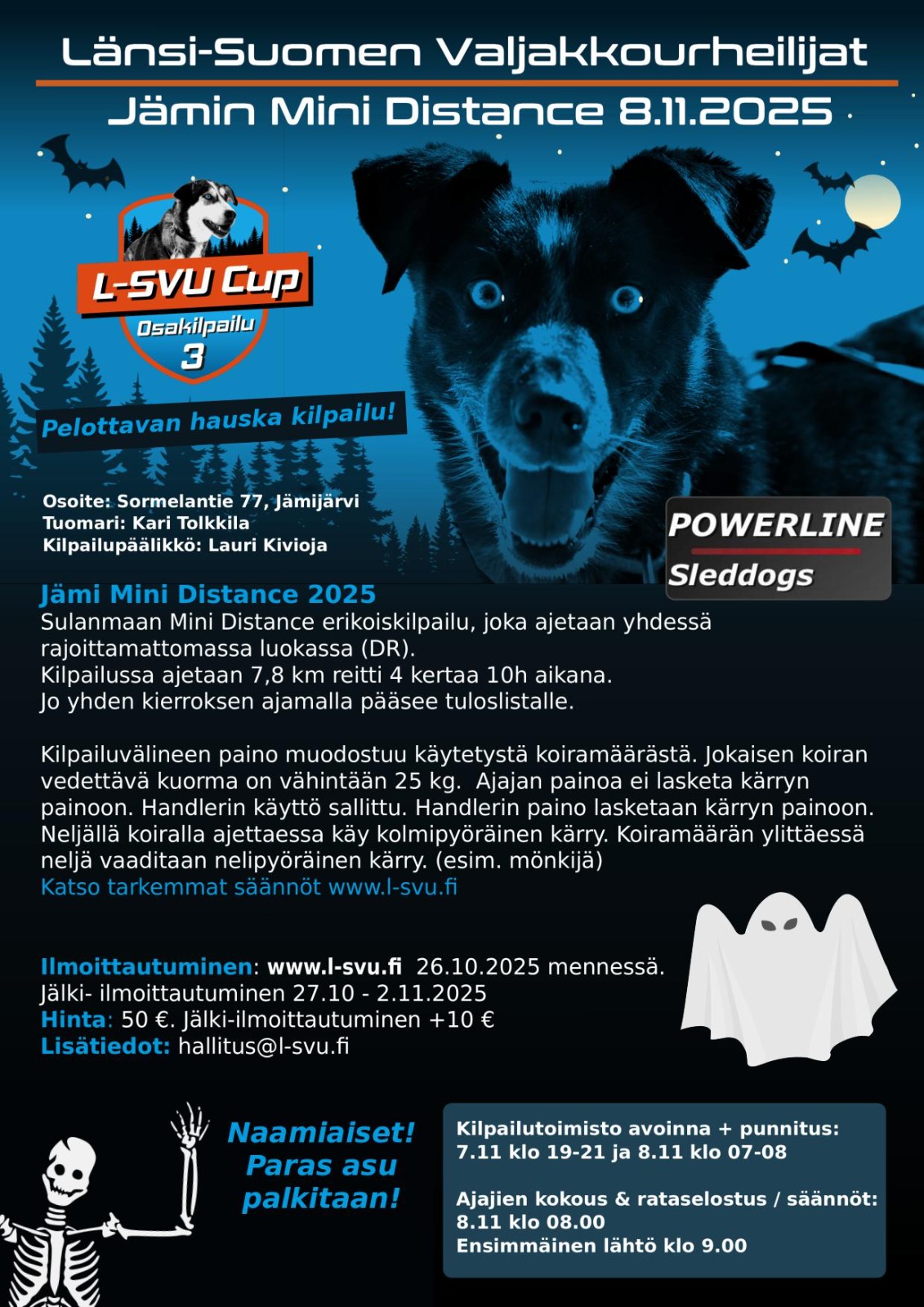 Lisäksi L-SVU tarjoaa vuokralle 105 kg painoista Orzech Cartin valmistamaa 4- pyöräistä kärryä. Kärry on varustettu istuimella kyytiläistä varten. Vuokraus on ensisijaisesti tarkoitettu 2 eri valjakkoa kilpailuun ilmoittaville tiimeille. Vuokraushinta 30 € / kilpailija. Ota yhteys toimisto(ät)l-svu.fi jos olet kiinnostunut vuokraamaan kärryä MiniDistancelle! KÄRRY VARATTU!!